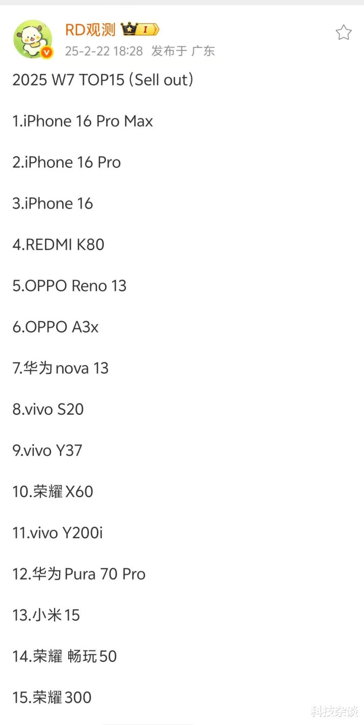根据他给出的数据这一周国内销量最好的机型是iPhone 16 Pro Max,销量第二好的机型是iPhone 16 Pro,排名第三的是iPhone 16。安卓阵营排名第一的是REDMI K80,排名第二的是OPPO Reno 13,接下来是OPPO A3x、华为 nova 13、vivo S20、vivo Y37、荣耀 X60、vivo Y200i、华为 Pura 70 Pro、小米 15、荣耀 畅玩 50、荣耀 300。从品牌的角度讲苹果有三款机型上榜,华为与小米、OPPO都是有两款机型上榜,vivo与荣耀都是有三款机型上榜。二三线品牌想进入这个榜单太难了,特别是在国内市场份额不足1%的那些品牌。